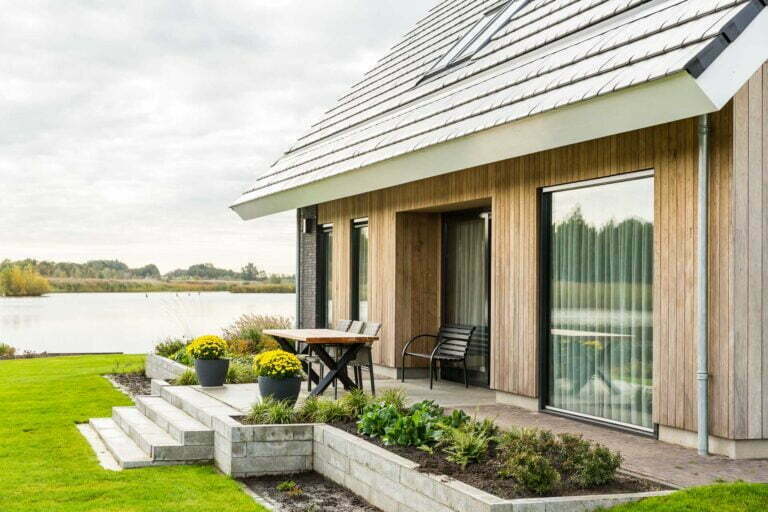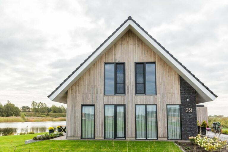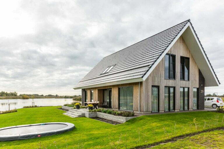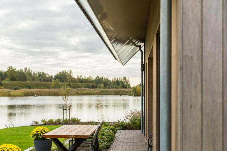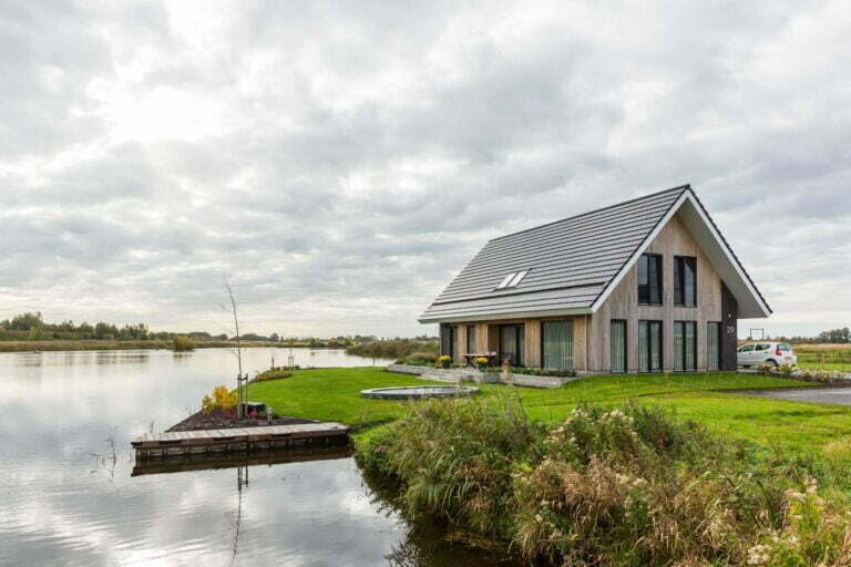 Deze energieneutrale woning weerspiegelt de natuur waarin deze gebouwd is. Aan de rand van het water gaat het houtwerk op in de rietkragen erom heen. De warmtepomp en zonnepanelen zorgen ervoor dat de impact op het milieu tot het minimum wordt beperkt.